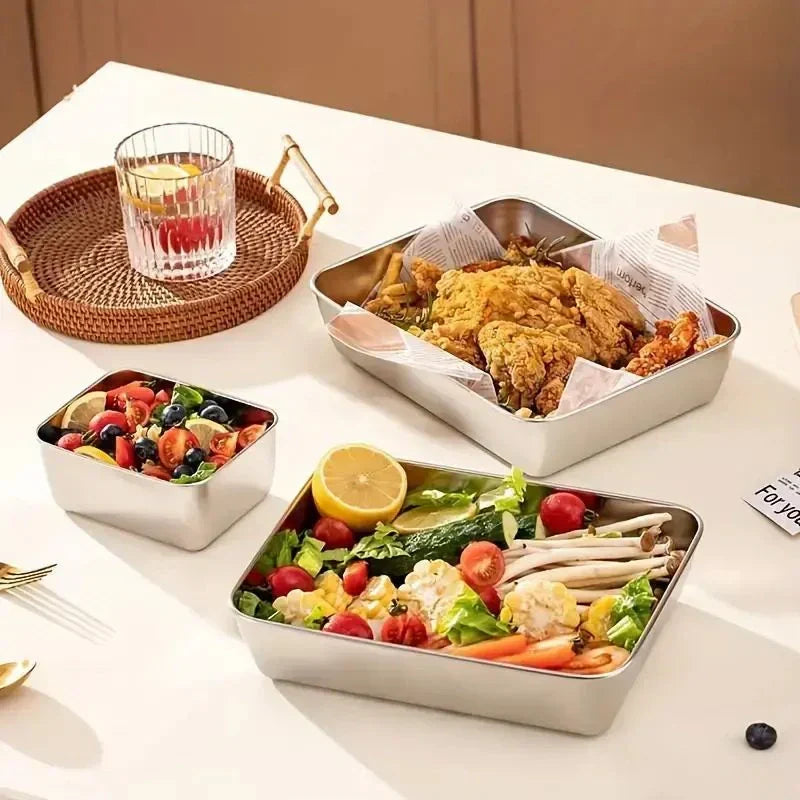 Criadas com aço inoxidável de alta qualidade, estas bandejas são verdadeiras joias para sua cozinha. O design moderno e as tampas transparentes à prova de vazamentos garantem não apenas a conservação perfeita dos alimentos, mas também uma apresentação impecável. Por que abrir mão da beleza no dia a dia?