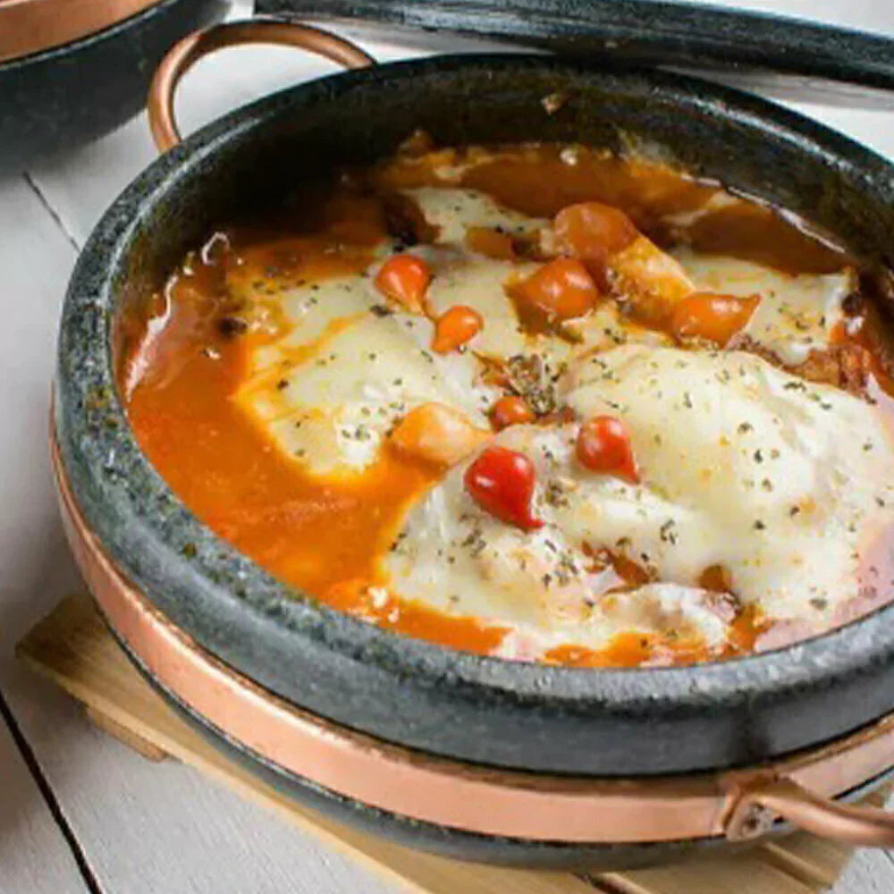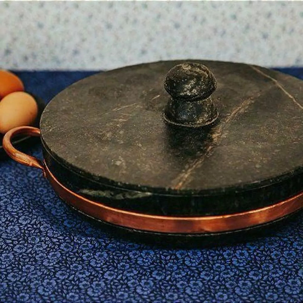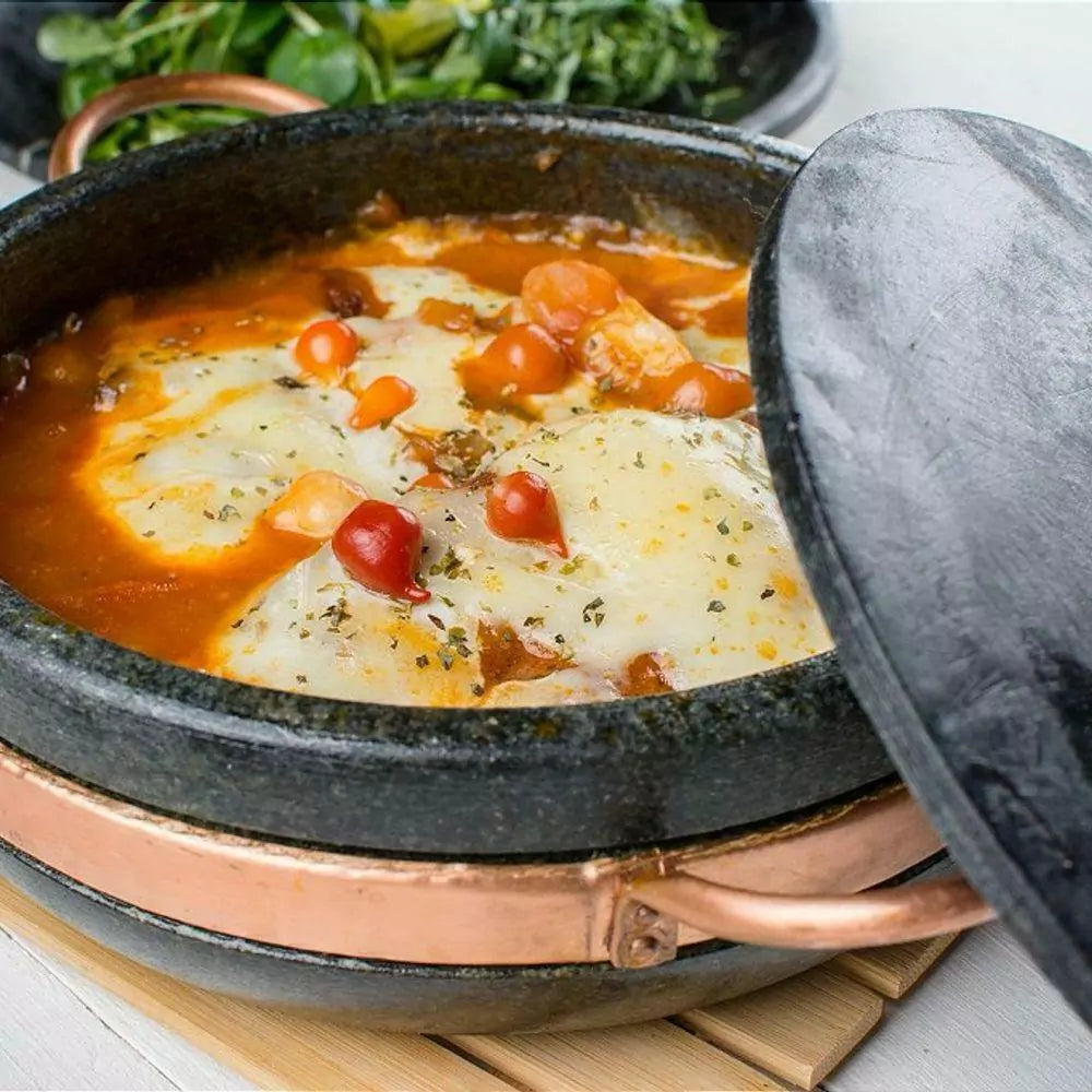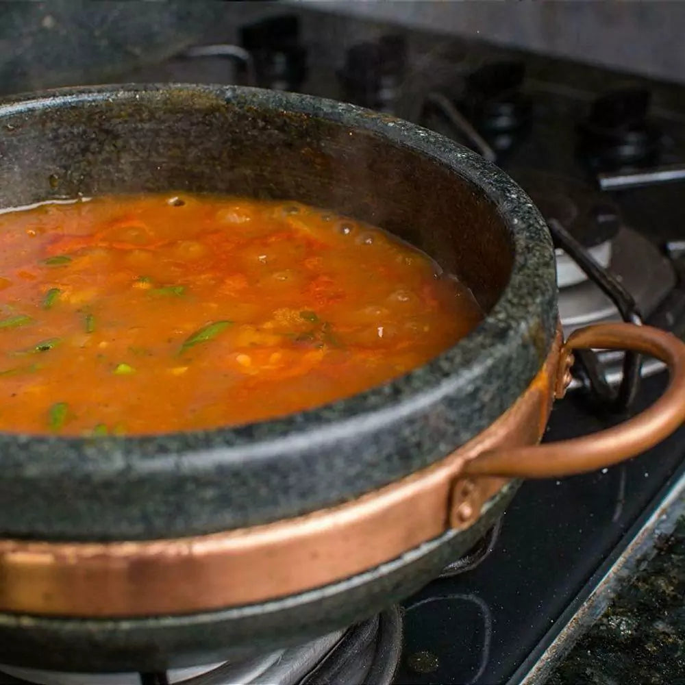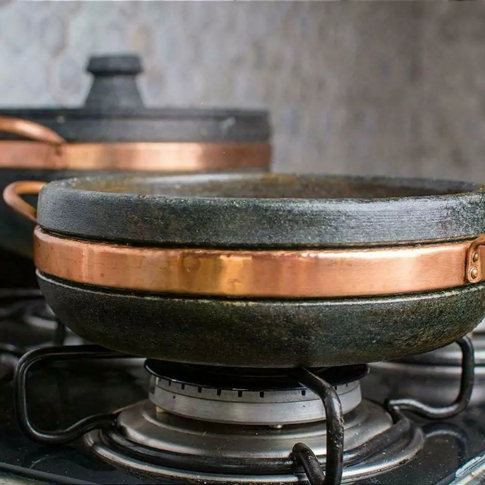 - Material: Pedra sabão e cobre (alças).