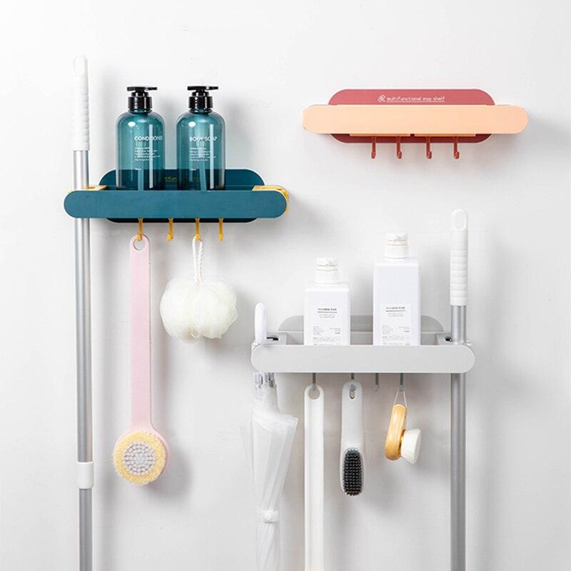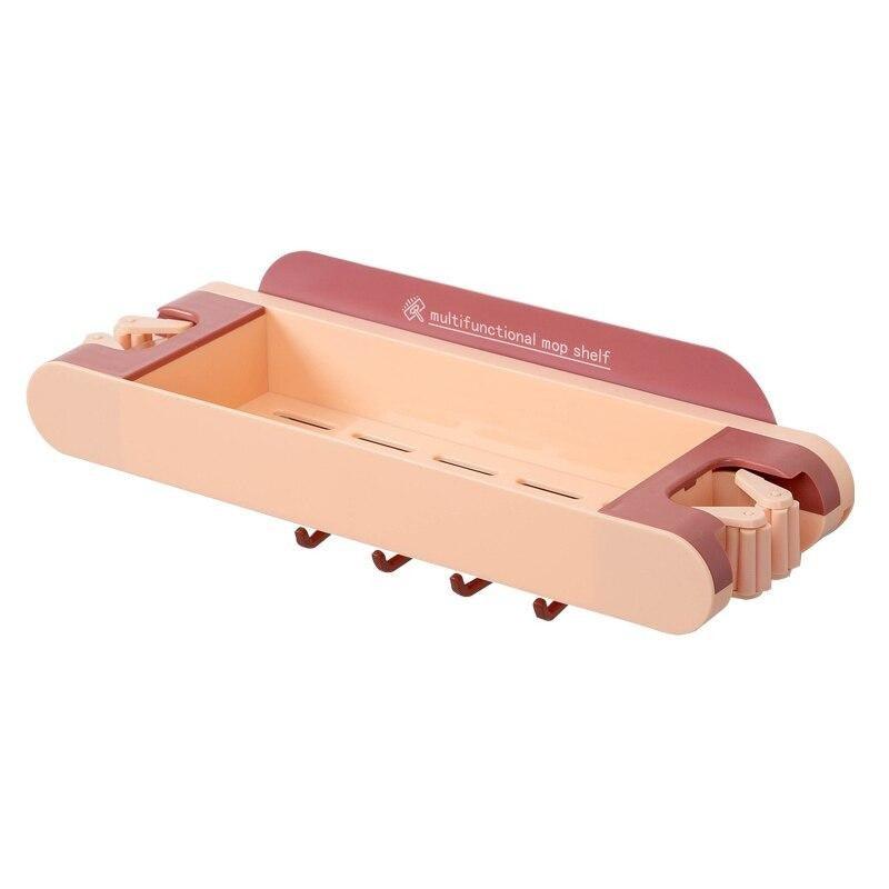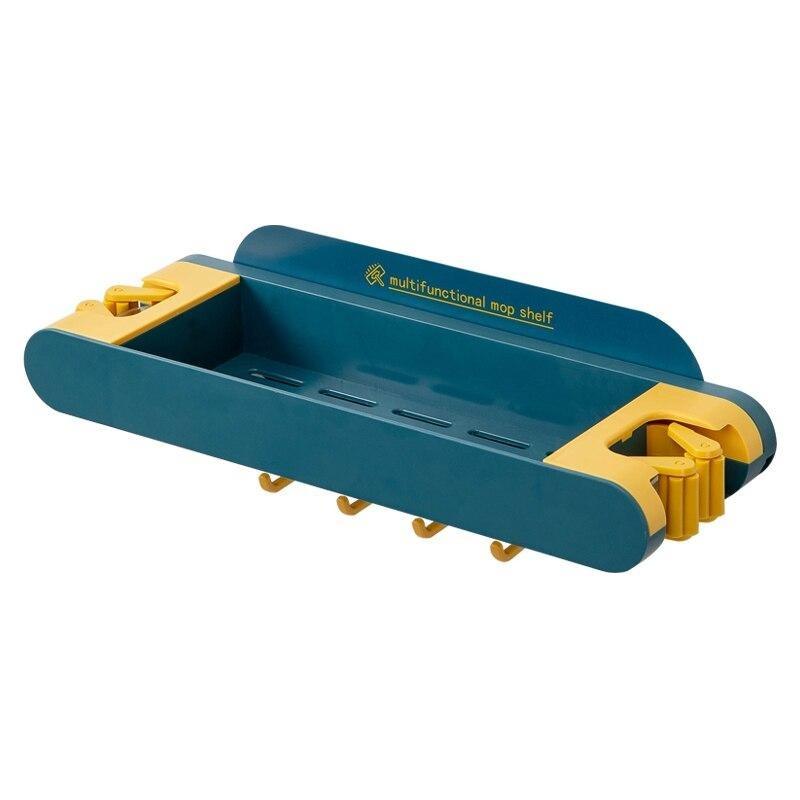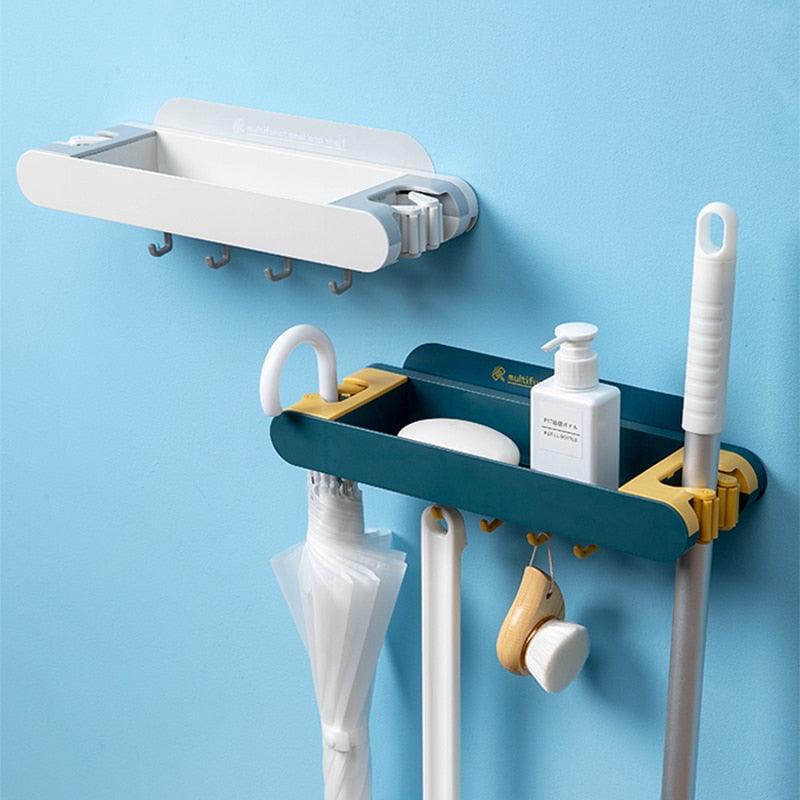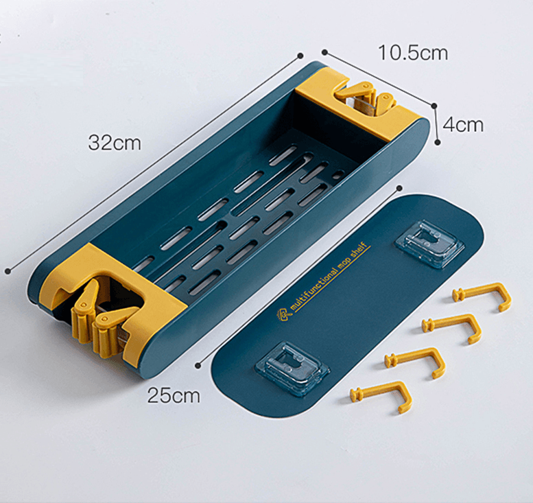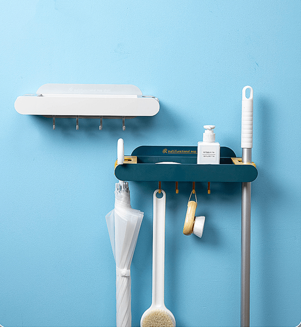 Com ganchos dos dois lados para prender qualquer utensilio de cabo como, vassouras, rodos, mops, guarda chuvas, etc...
