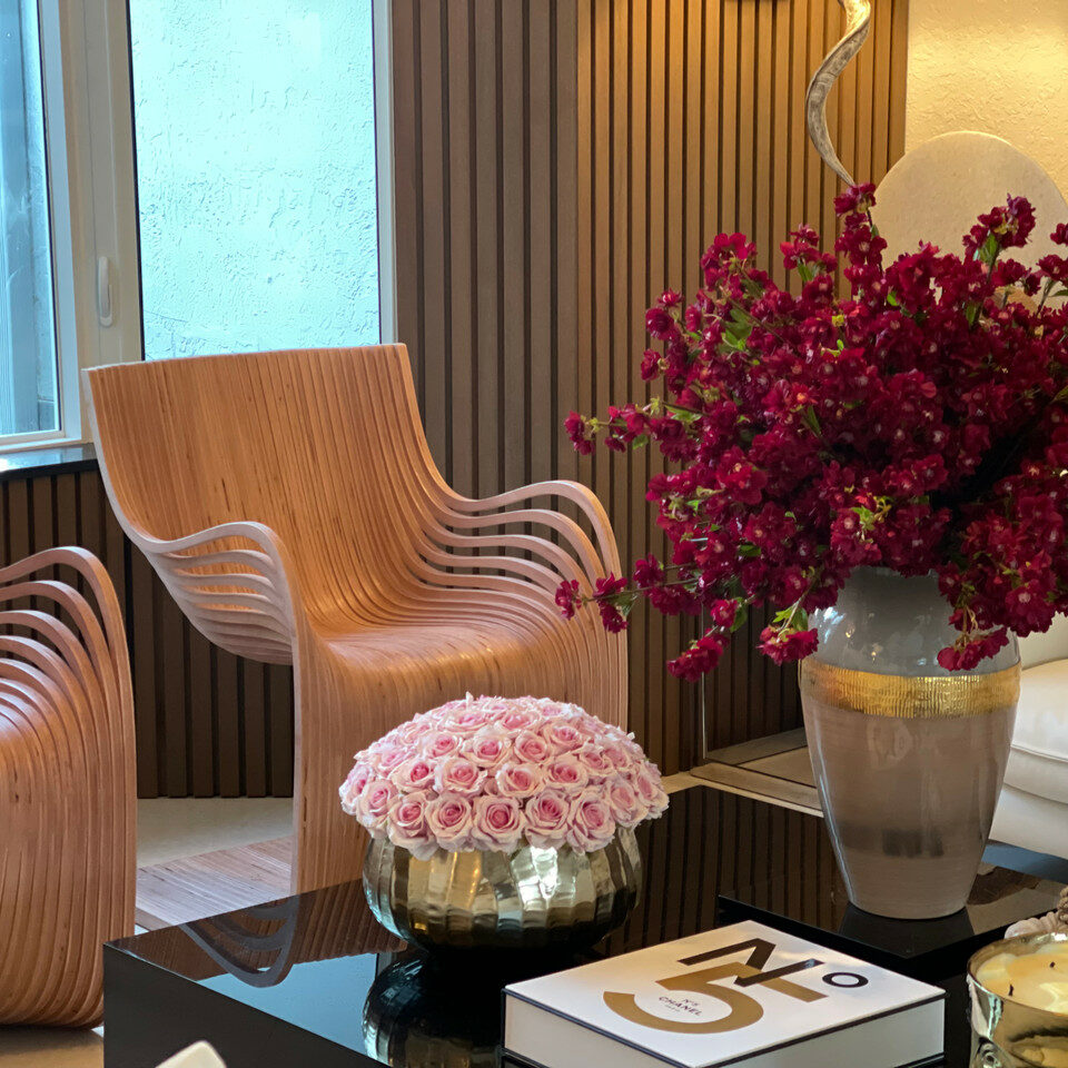 Este bouquet elegante de cereja bordô adiciona um toque fresco e elegante a qualquer ambiente. Os ramos são apresentados num vaso de vidro da nossa deusa, ancorados em água ilusão e são o acento decorativo perfeito para uma grande mesa de centro ou consola de sala de jantar.